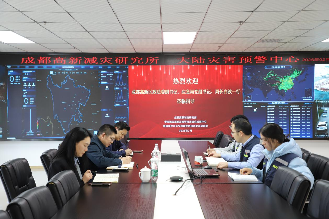 2 月 11 日,成都高新区政法委副书记、应急局党组书记、局长白波一行到访成都高新减灾研究所(简称“减灾所”)、成都市美幻科技有限公司(简称“美幻科技”),看望慰问专家人才王暾博士,并就多灾种预警技术的发展和应用进行调研指导。